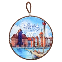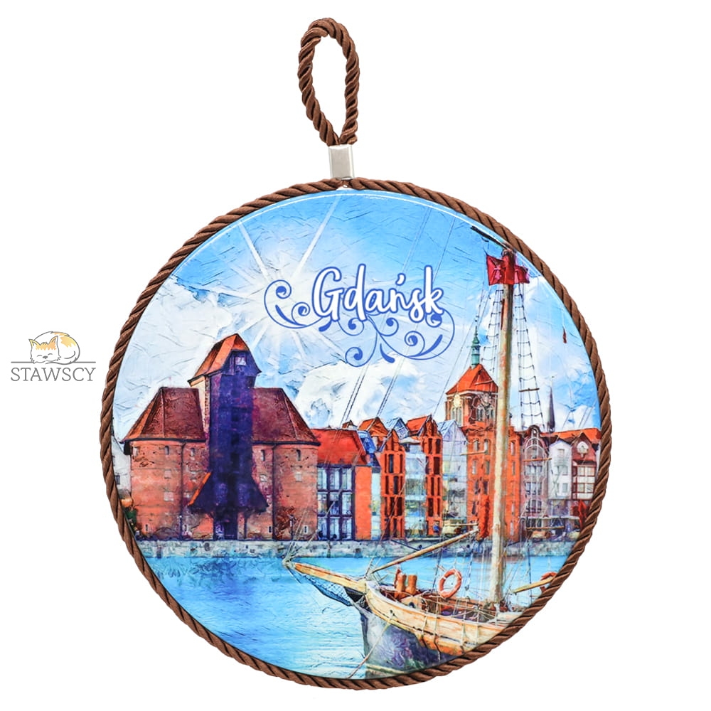 To ceramiczna podstawka ozdobna z motywem Gdańska. Na powierzchni widnieje kolorowa grafika przedstawiająca charakterystyczną panoramę miasta z widokiem na Żuraw nad Motławą oraz zabytkowe kamienice.