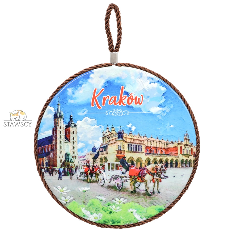 To jest ceramiczna podstawka ozdobna przedstawiająca malowniczy widok Krakowa.