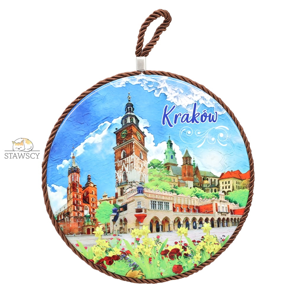 To piękna, ceramiczna podstawka ozdobna inspirowana malowniczymi widokami Krakowa. Na jej powierzchni znajduje się artystyczna ilustracja przedstawiająca najważniejsze zabytki miasta, w tym Wieżę Ratuszową, Sukiennice, Kościół Mariacki oraz majestatyczny Wawel w tle.