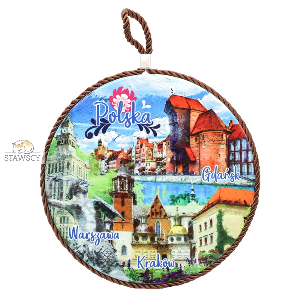 Ceramiczna podstawka dekoracyjna z motywem Polski, przedstawiająca trzy znane miasta: Warszawę, Kraków i Gdańsk. Ilustracja ma styl akwarelowy i zawiera charakterystyczne zabytki, takie jak: