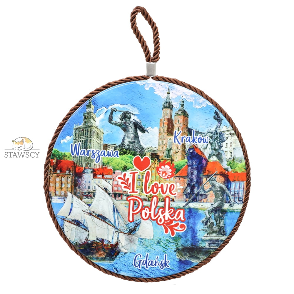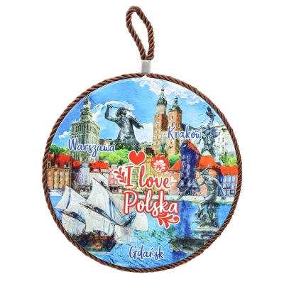 Ceramiczna podstawka dekoracyjna z motywem Polski, przedstawiająca trzy znane miasta: Warszawę, Kraków i Gdańsk. Ilustracja ma styl akwarelowy i zawiera charakterystyczne zabytki, takie jak:
