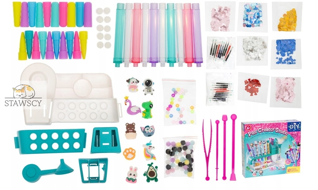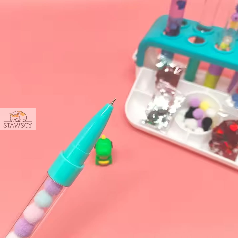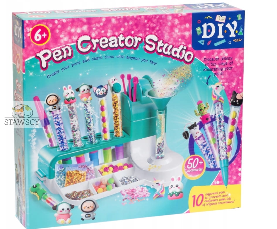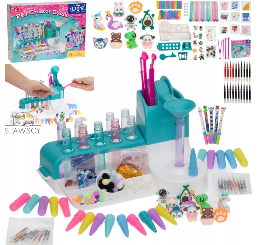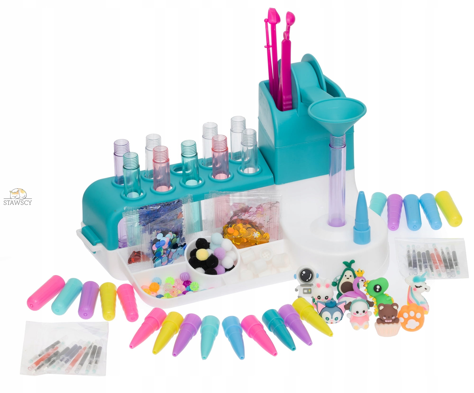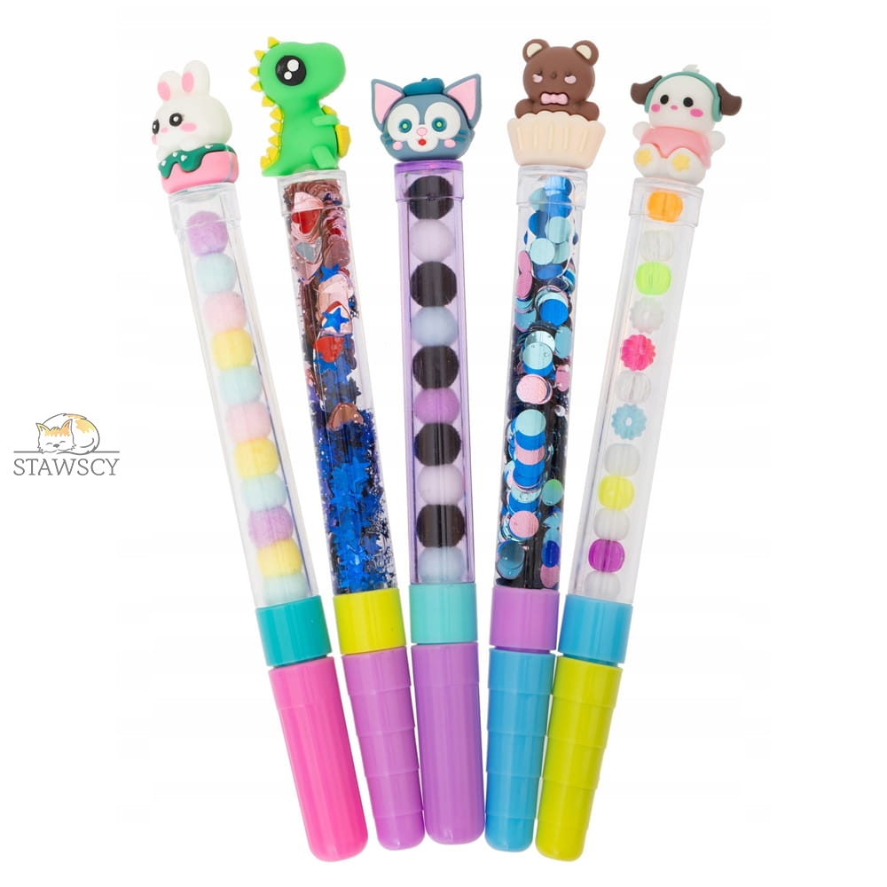 Ta zabawka jest kreatywna, ponieważ pozwala dzieciom samodzielnie projektować i tworzyć własne długopisy – od wyboru kolorów, przez dobór dekoracyjnych wypełnień (jak brokat, pomponiki, konfetti), aż po dodawanie zabawnych nakładek w kształcie zwierzątek czy postaci. Nie ma jednego „dobrego” sposobu na zrobienie długopisu – każde dziecko może stworzyć coś zupełnie innego, zgodnie ze swoim gustem i wyobraźnią.
